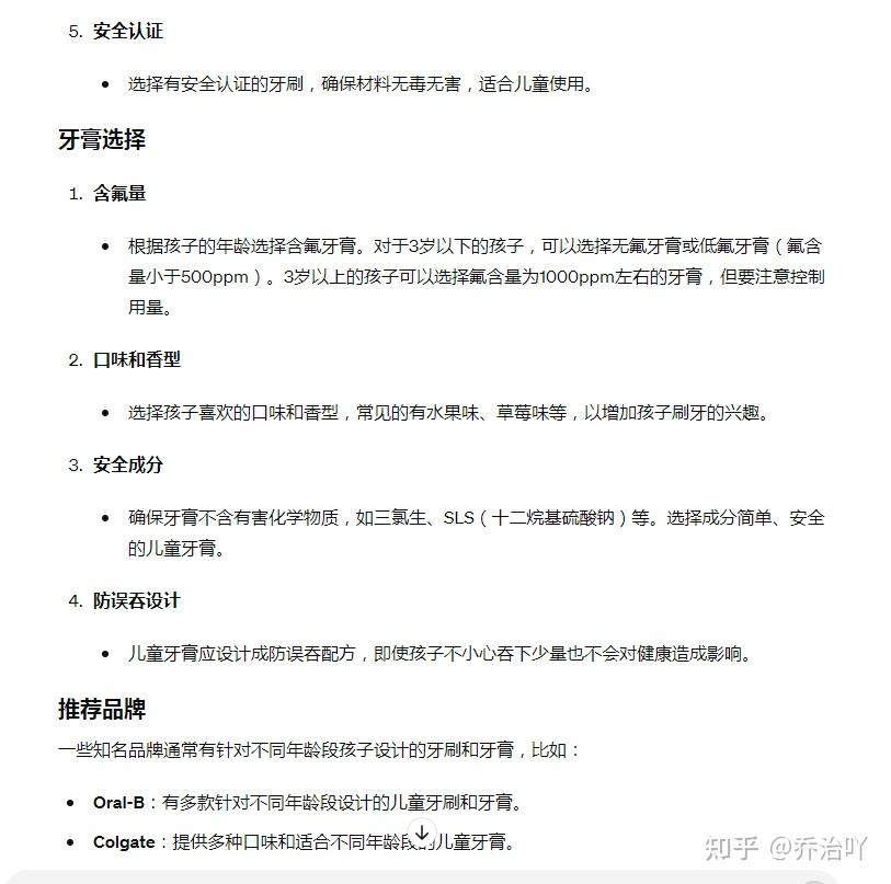 看到ChatGPT对于这个问题的解答,逻辑条理非常清晰,但是有些更加精细的细节还是需要自己去甄别的,比如回答中的牙膏和牙刷的品牌是否存在,具体到孩子到底喜欢哪种品牌的牙膏和牙刷,这个就需要继续问ChatGPT或者自己带孩子去尝试了。