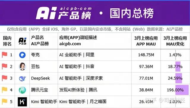 3月份发布的“AI产品榜·国内总榜”显示,夸克以1.48亿MAU的成绩位居榜首,超过字节豆包(9736万)、DeepSeek(7701万)和腾讯元宝(3884万),而在上个月及以前,很多AI产品榜单中是没有夸克身影的。