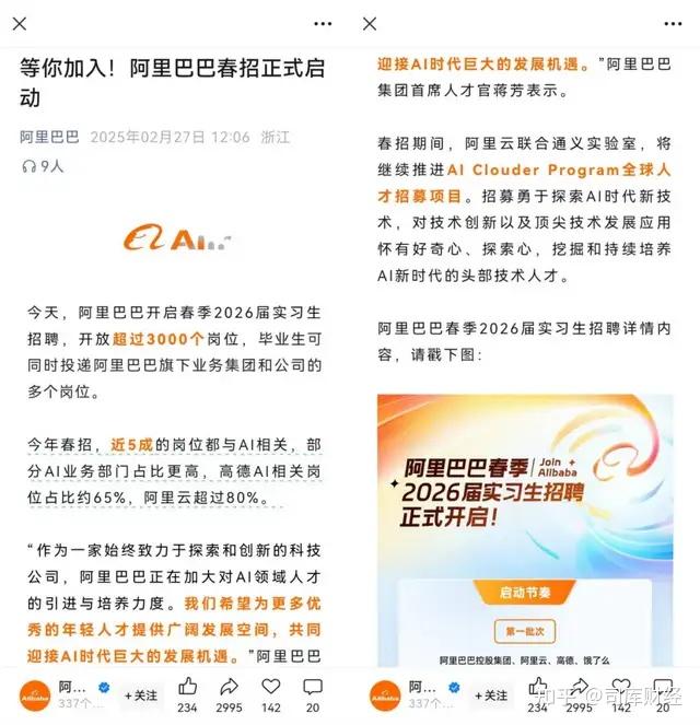为了完成这一目标,阿里开始大力招聘人才。今年阿里巴巴春招,近5成的岗位都与AI相关,部分AI业务部门占比更高,高德AI相关岗位占比约65%,阿里云超过80%。