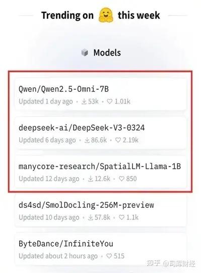 全球最大的AI开源社区Hugging Face更新大模型榜单,通义千问的Qwen2.5-Omni以接近满分的成绩登上榜首,DeepSeek-V3-0324和群核的SpatialLM-Llama-1B分列二三位。