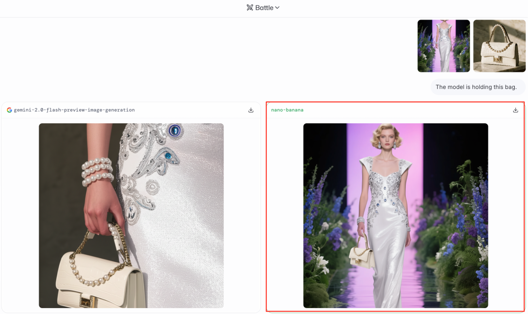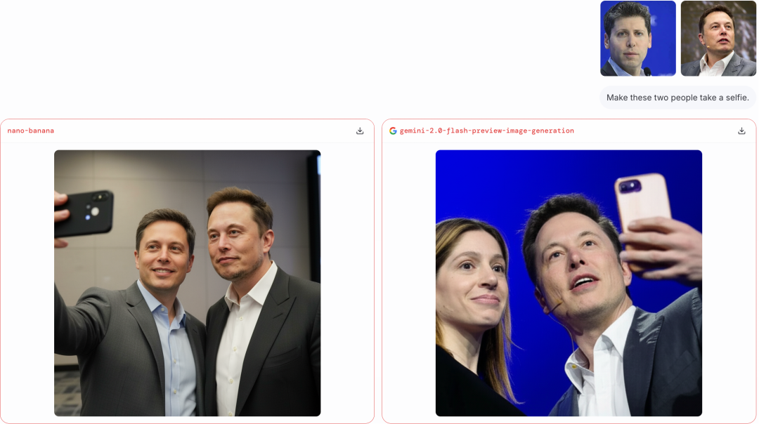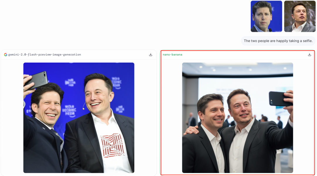 Gemini 2.0 flash 生成的效果完全认不出这两个大名人,而 Nano Banana 将二人完美融入图三环境中,不过手指等细节方面还是有瑕疵。