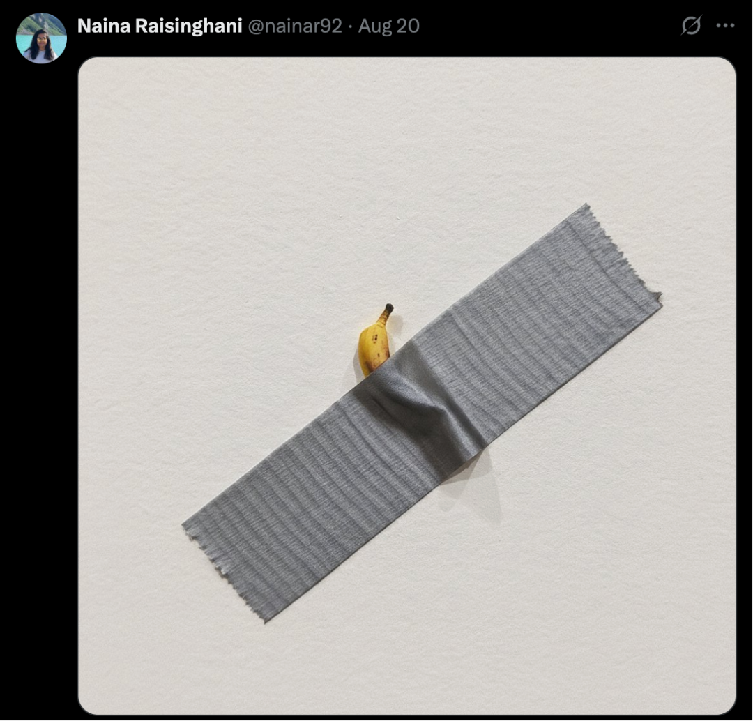 谷歌 DeepMind 产品经理 Naina Raisinghani 也发布了一张与意大利艺术家 Maurizio Cattelan 2019 年创作的胶带粘贴香蕉艺术作品类似的图片。