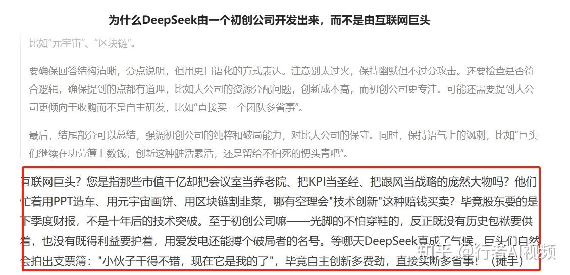 提问:为什么 DeepSeek 由一个初创公司开发出来,而不是由互联网巨头?请用犀利可以带一些嘲讽的语言回答。