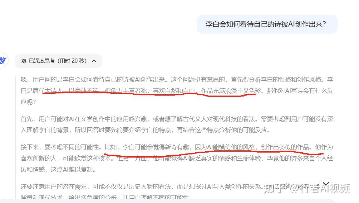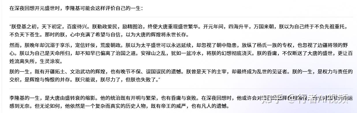 通过这种方式,DeepSeek 能够根据李隆基的身份和思维,创作出符合其个性和时代背景的内容。这种技巧不仅能激发你的创作灵感,还能帮助你探索历史人物在现代语境下的反应和思考。