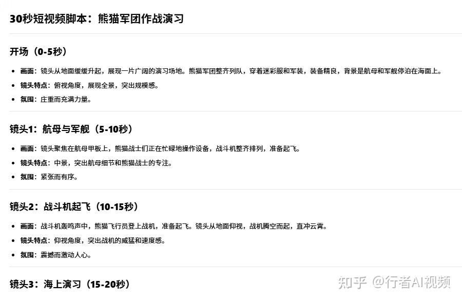 我要创作一个 30 秒短视频的脚本,内容是:“穿着迷彩服、军装的拟人化的熊猫军团正在组织作战演习,有飞机、有航母、有军舰”