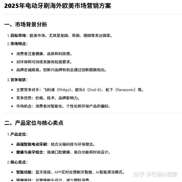 先看案例,比如”写一份面向海外欧美销售电动牙刷的 2025 年市场营销方案“。