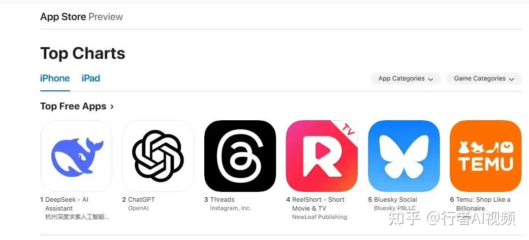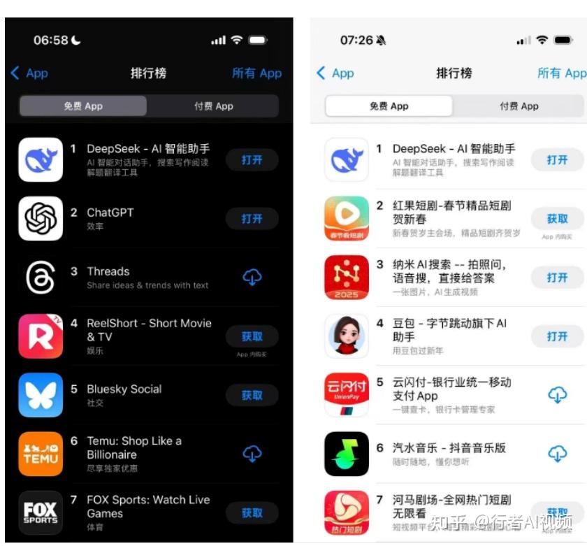 DeepSeek 应用成功登顶了 15 个国家和地区的免费 APP 下载排行榜。在中国和美国区,DeepSeek 在苹果 App Store 的免费榜上均位列第一,超越了 ChatGPT 以及 Google、Microsoft 等科技巨头的 AI 产品。