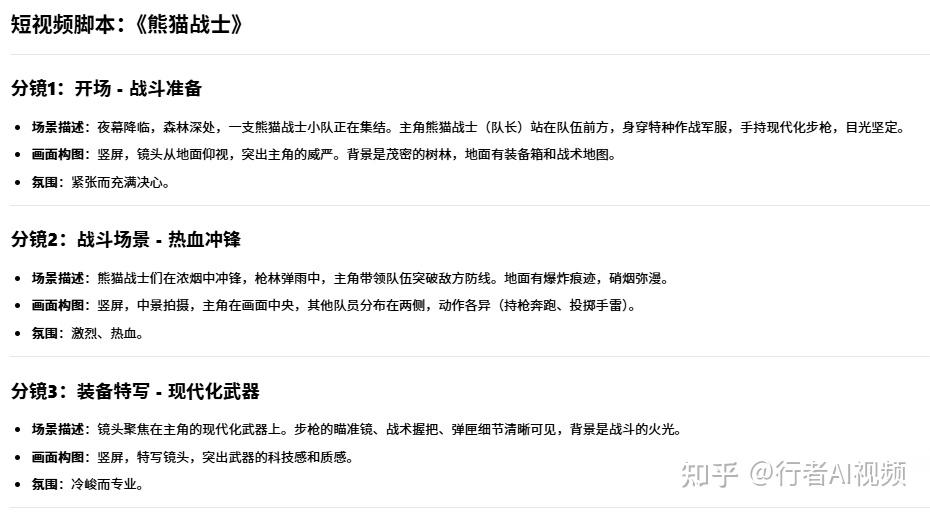 传统提示词:我要创作一个短视频,需要制作 6 幅分镜图。 主角是拟人化的熊猫战士,身穿特种作战军服,手拿现代化的武器,主角可以是一个,也可以是成群结队的。 请你创造一个军事题材的脚本,并生成 6 张分镜图,要求生成图为竖向图,写实摄影风格。 制作好脚本后连续输出图片,保持风格统一,主角形象统一,包含多场景的军事装备,战斗场面,训练场面,特写镜头描写等,体现出热血感。