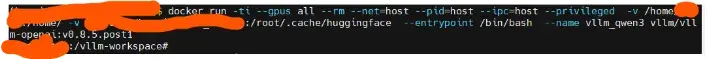 tips:如果不想docker启动的同时运行某个命令,可以在命令行添加–entrypoint /bin/bash,这样的话,启动docker即直接进入命令行,不会自动启动server部署Qwen3模型,如下图