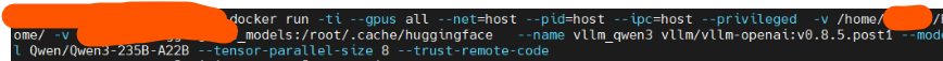 vllm/vllm-openai:0.8.5.post1 - docker容器启动:dockerhub里的vllm镜像最后一个命令为ENTRYPOINT,意味着docker启动的同时会运行的命令,所以这个vllm镜像启动的同时会启动openai server,因为我们部署的是Qwen3-235B-A22B,所以我们需要在命令行指定该model,否则默认部署的是opt-125M。此外指定tp为8,使用8卡来部署。(4卡也可,只要装得下参数且能有余量保存足够的kv cache就行)