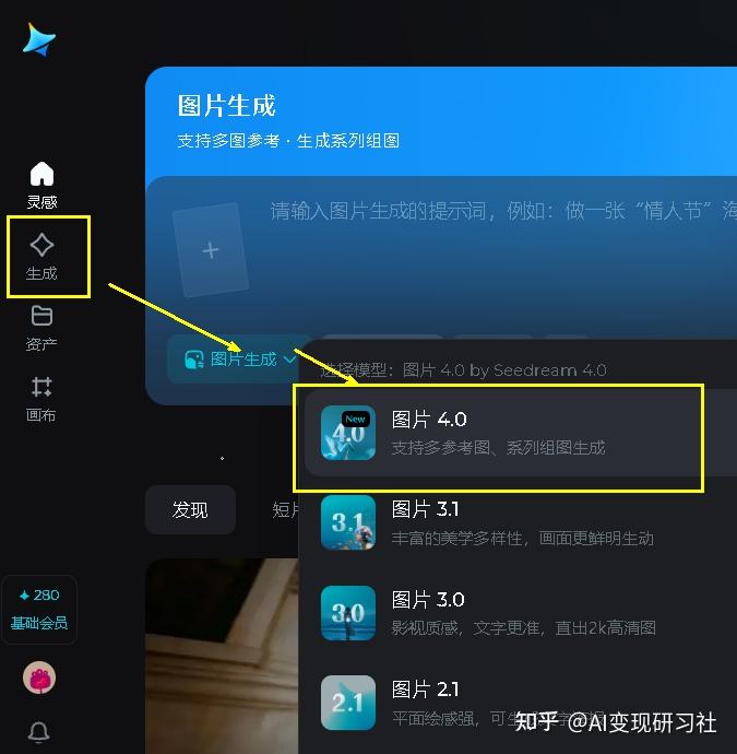 进去后选择“生成”进“图片生成”,选择“即梦 4.0 图形” 即可使用