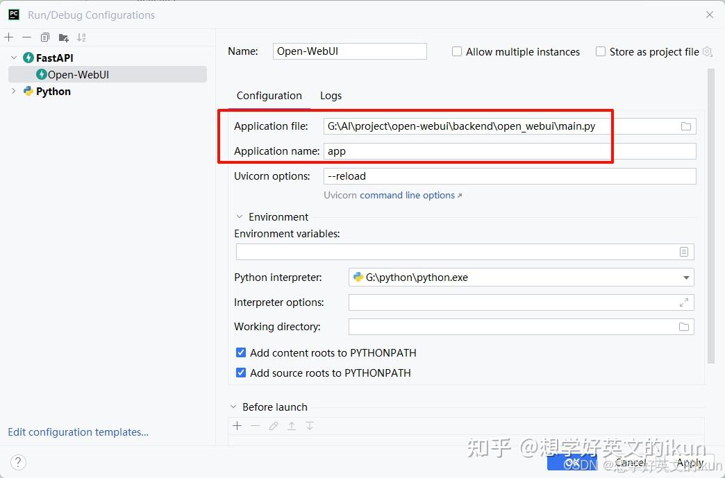 - Application file 选择 backend\open_webui\main.py 文件,Application name 填写 app