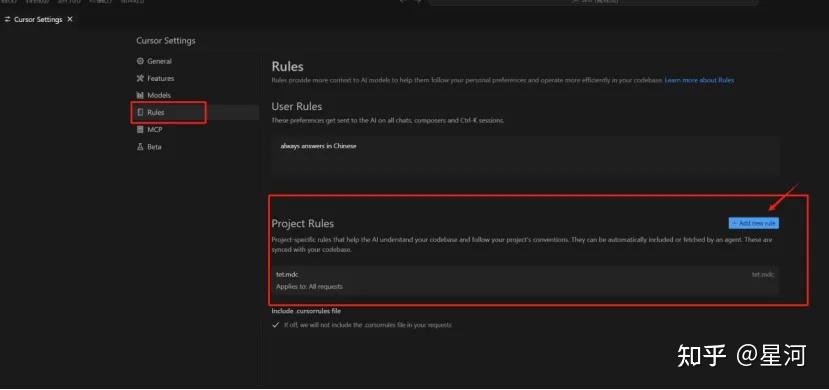 1. 在“设置->Cursor Rules->Project Rules”里进行添加: