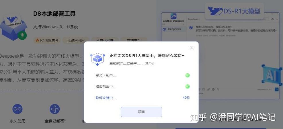 软件目前部署的版本是R1深度思考(有新版本随时更新),部署完成后无联网可用,响应无延迟,可以永久使用。