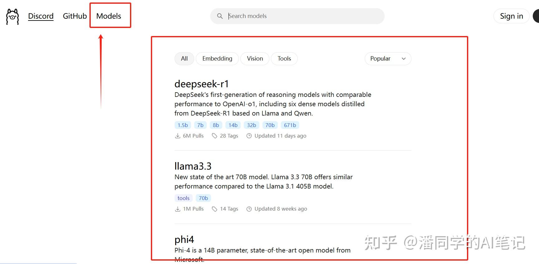 安装DeepSeek-r1模型 还是在刚才的Ollama网站,选择Model模块,选择deepseek-r1这个模型