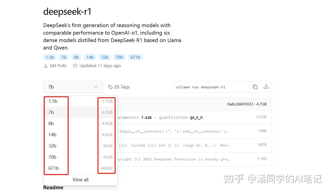如果你电脑运行内存为8G那可以下载1.5b,7b,8b的蒸馏后的模型