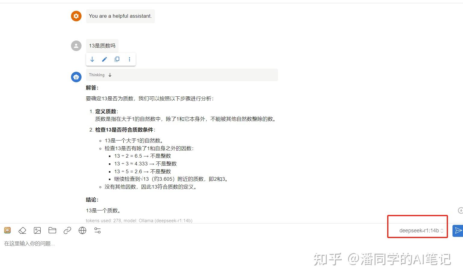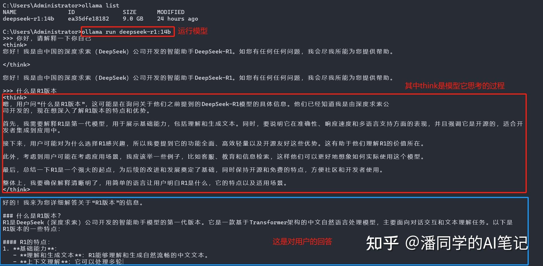 启动成功后,就可以输入我们想问的问题,模型首先会进行深度思考(也就是think标签包含的地方),思考结束后会反馈我们问题的结果。