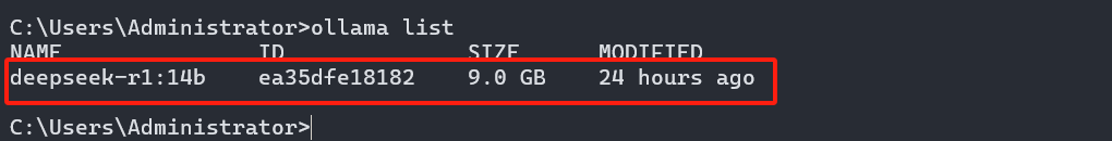 我们也可以在命令行中输入,ollama list 查看是否成功下载了模型,下图的内容表明下载成功