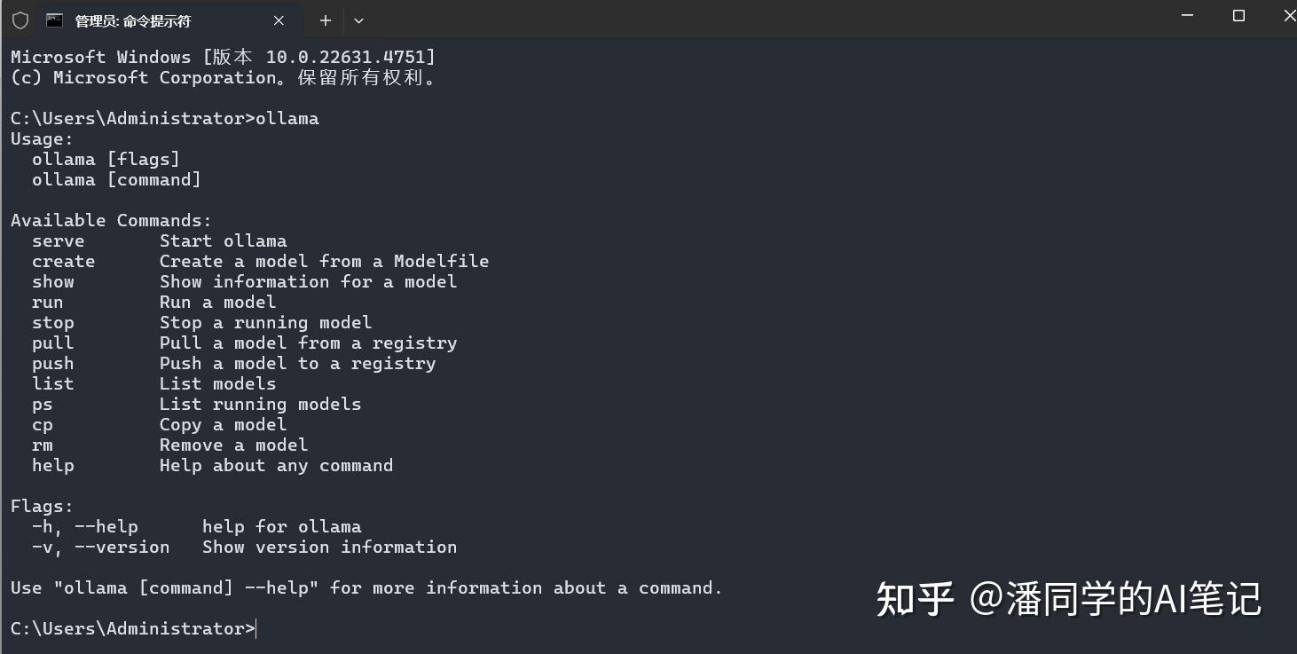 安装之后,Ollama已经运行了,它是CMD命令工具,我们可以在命令行输入ollama来验证,是否安装成功
