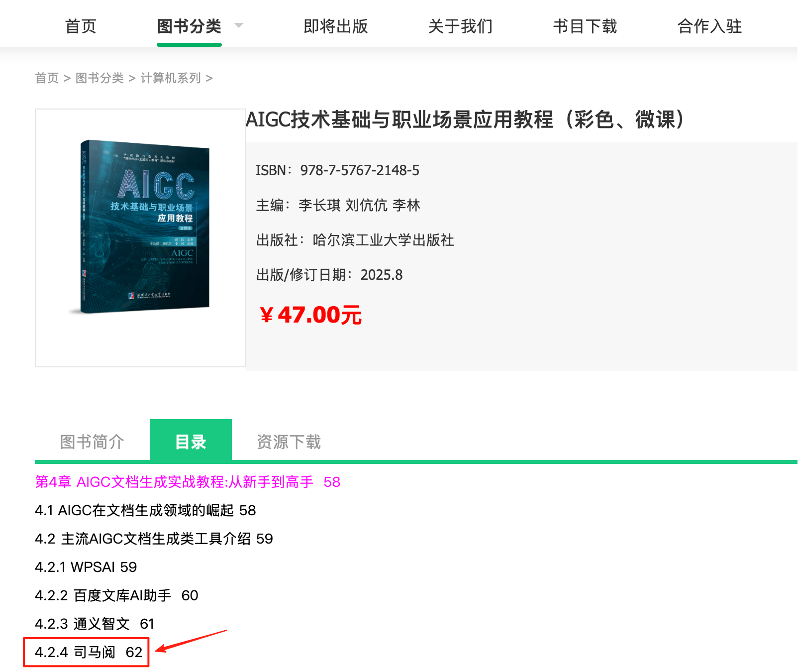 近日,司马阅凭借在文档智能领域的技术实力、AI落地能力及创新实践案例,被正式编入职业教育教材《AIGC技术基础与职业场景应用教程》,将AI技术与具体职业场景深度融合。
