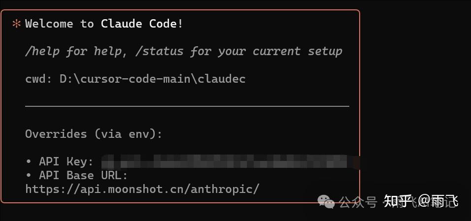 保存完之后,重新打开一个新的命令行,登录 ClaudeCode ,看到类似下方的界面,表示已经启动了 Kimi 的 API 。