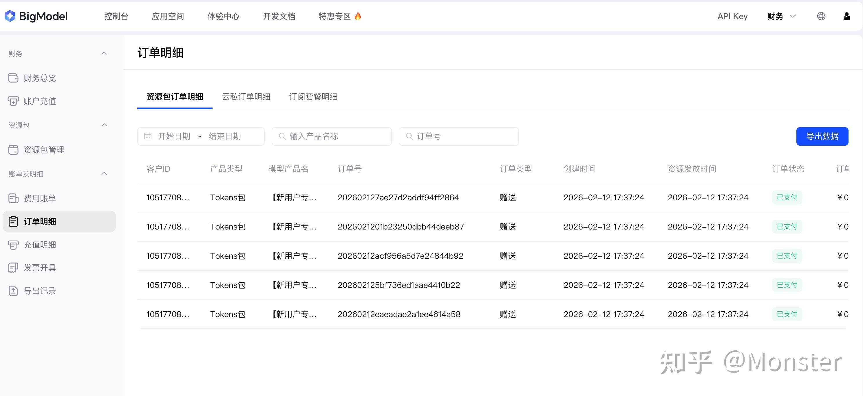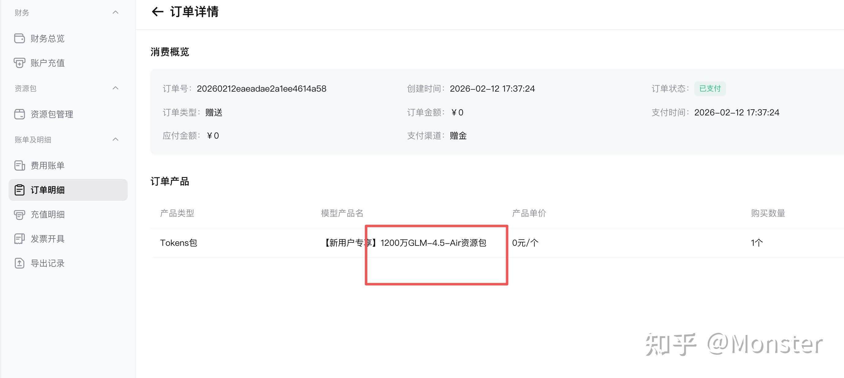 - 完成之后,财务界面-> 订单明细中会有赠送的 token智谱AI开放平台