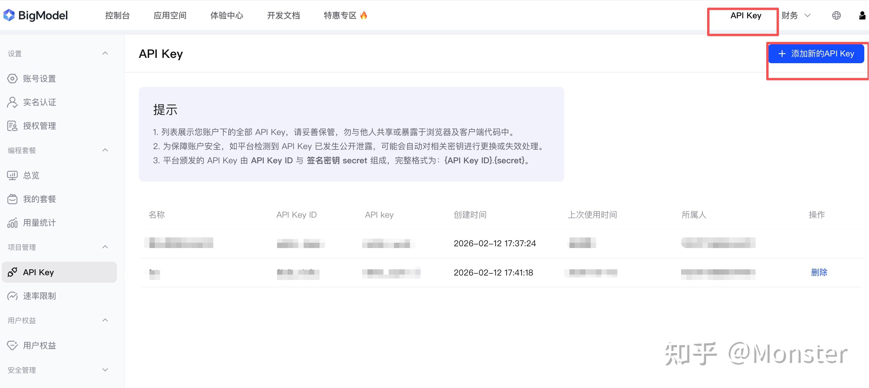 6. 点击左上角的,“API Key” 点击 “添加新的API key ” 智谱AI开放平台