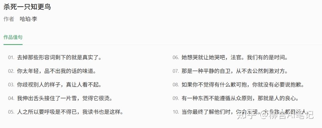 比如,我要查《杀死一只知更鸟》里面的金句,只要输入书名,金句自动就搜出来了。