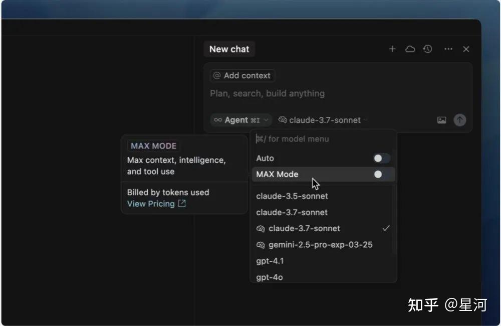 Cursor现在对所有的高级模型都适配了Max模式,启用方法是在聊天对话框中选择模型,打开“Max Mode”开关即可。