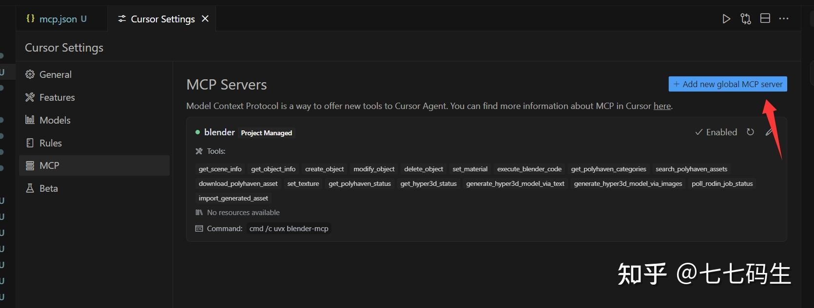 配置blender的MCP服务,文件内容如下: