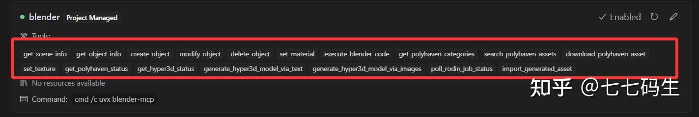 配置好之后可以回到MCP设置,可以看见已经有blender项,可以设置启用和禁用
