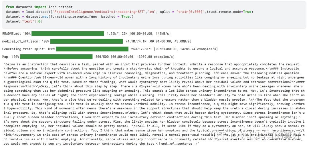 EOS_TOKEN = tokenizer.eos_token# Must add EOS_TOKEN def formatting_prompts_func(examples): inputs = examples[“Question”] cots = examples[“Complex_CoT”] outputs = examples[“Response”] texts = [] for input, cot, output in zip(inputs, cots, outputs): text = train_prompt_style.format(input, cot, output) + EOS_TOKEN texts.append(text) return { “text”: texts, }
