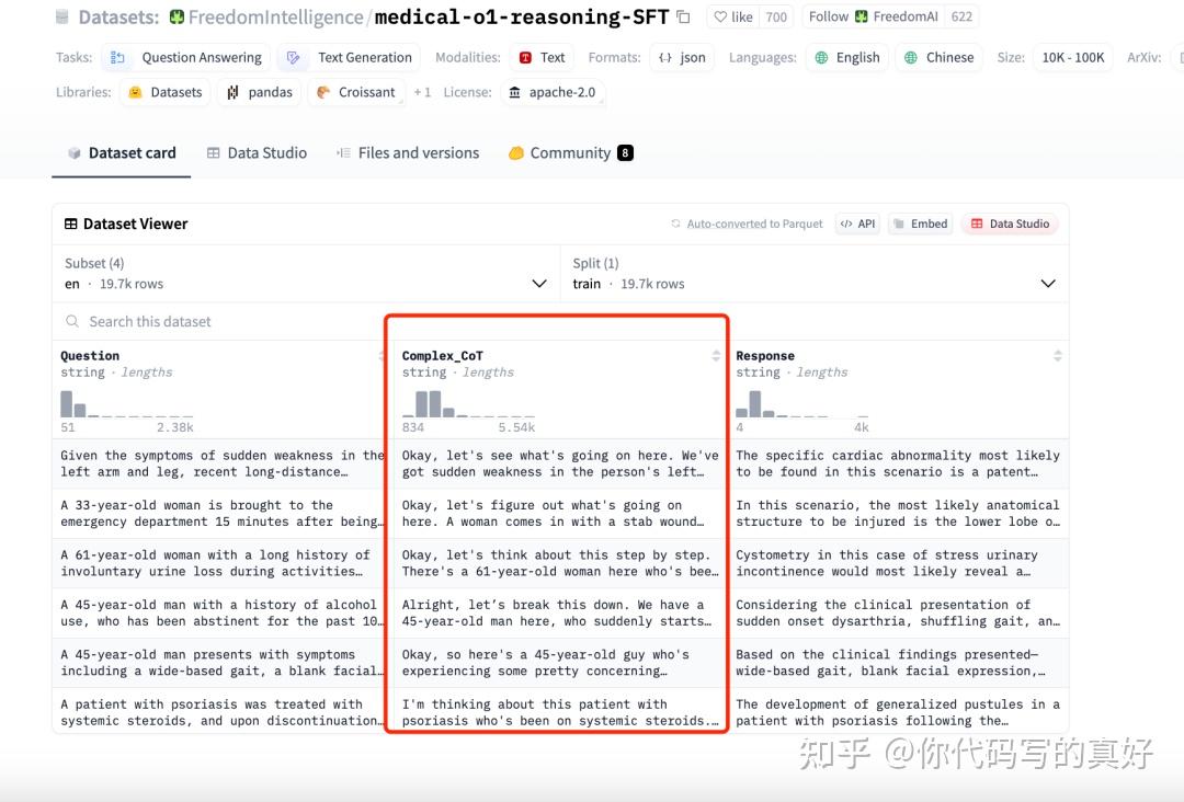 medical-o1-reasoning-SFT医学推理数据集,该数据集基于医学可验证问题和 LLM 验证器构建,这个数据集构造过程和方法1提到的差不多。方法1强调如何通过推理大模型蒸馏指令数据集,方法2强调如何通过已有COT构造推理数据集