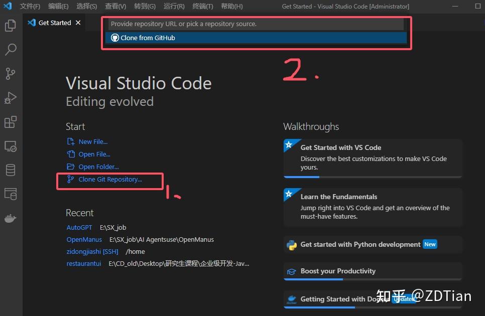 首先,打开VSCode,将github上的项目克隆地址输入完成克隆:
