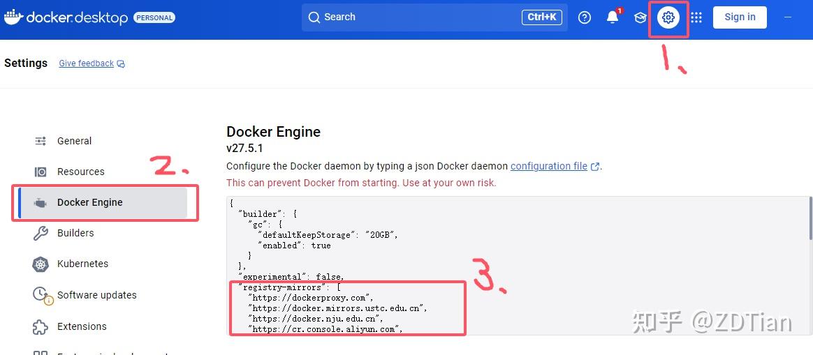 ② 复制好镜像源之后,docker desktop是支持可视化的镜像配置操作的,大家可以根据下图完成配置: