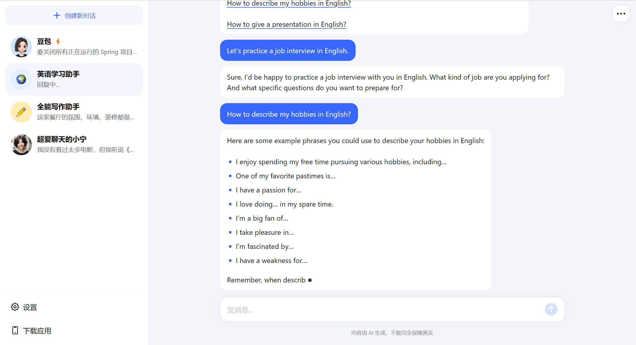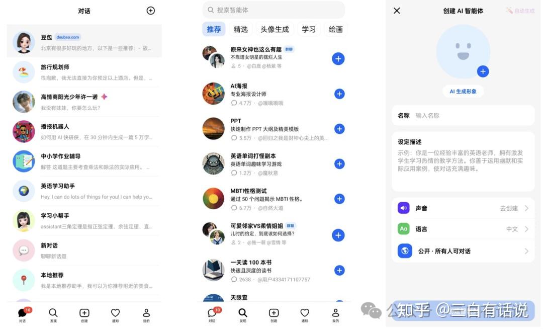 - PGC智能体:第二部分是豆包官方创建的智能体,目前豆包官方创建了25个官方智能体,包括AI图片生成、爱聊天的小宁、全能写作助手等;