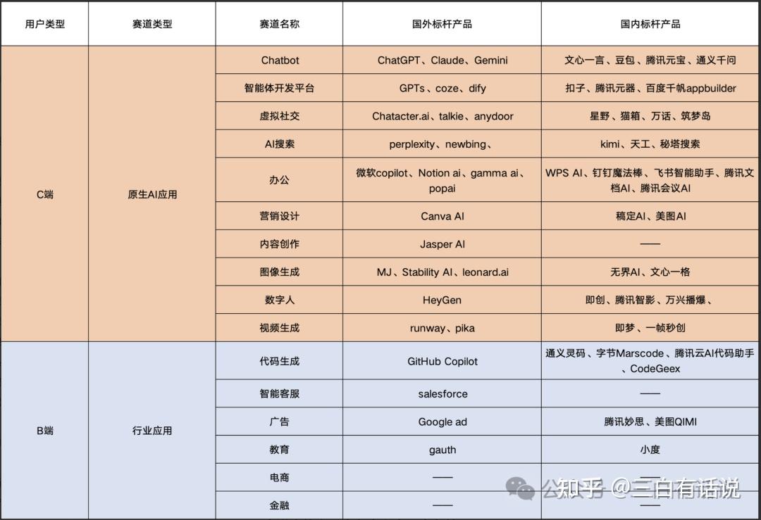 对于目前的AI的赛道,个人总结赛道的整体布局如下,其中今年上半年比较火热的应用领域,基本聚焦在chatbot、智能体开发平台、虚拟社交、AI搜索这几个领域: