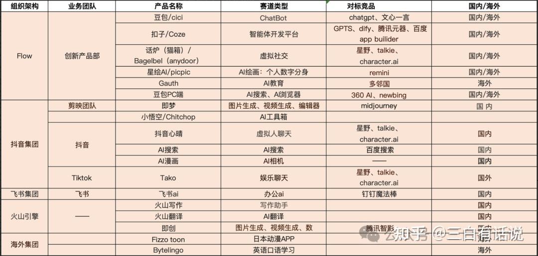 从去年的6月份开始,字节已经开始密集的布局AI领域的应用,去年8月的时候,字节还只是上线了豆包、小悟空等少数几个产品,半年多过去,目前字节在国内和国外已经上线了十几个AI应用,覆盖了不同的热门赛道,可谓全面开花,基本在大厂里面,在AI应用层如此激进的,基本也就字节了;