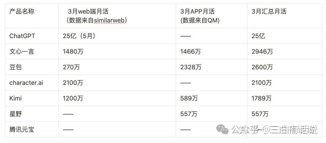 对于国内,文心一言目前根据QM和similarweb提供的相关数据,截止今年3月份WEB+APP的整体月活将近3000万左右,而豆包截止5月对外公开的月活规模是2600万,其后是kimi月活将近1800万;