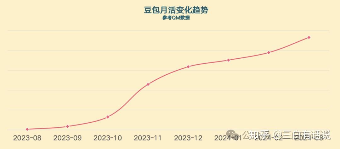 23年8月份的时候豆包开始灰度上线,当时的用户体量还不是很大,月活可能10万都不到,并且在8~10月份一直保持着自然增长,根据QM公开的数据统计,豆包的整体活跃在11月份的时候开始了跳跃性的增长,月活已经开始超过1000万,个人猜测产品从11月份开始对外投放广告,因此带来了比较明显的增长,后来又经过半年左右的时间,5月月活规模达到2600万规模(参考字节官方公布数据);
