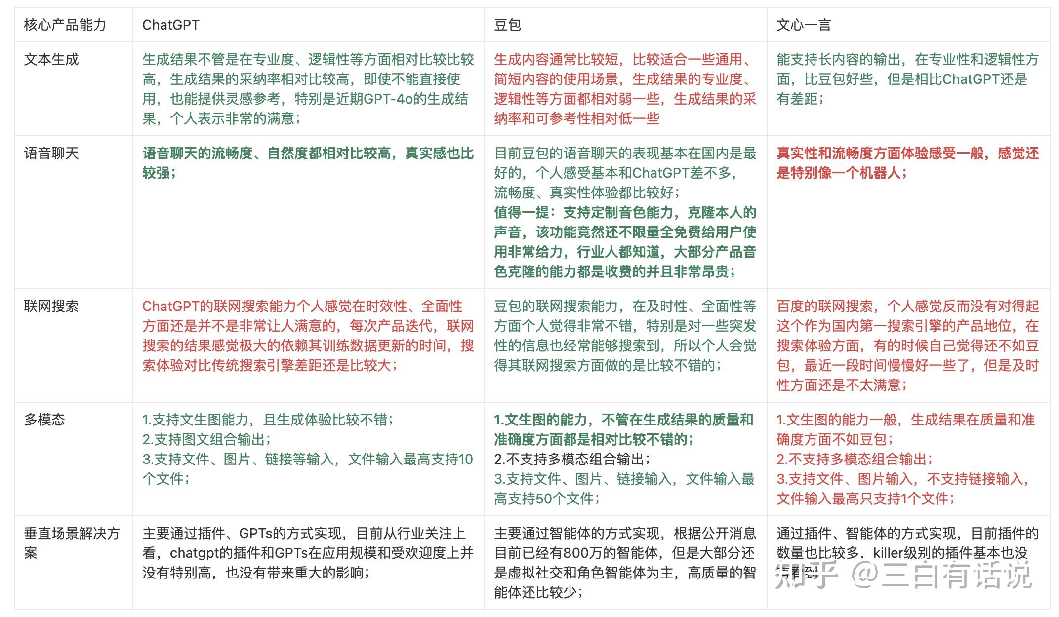 以下为个人对豆包及其核心竞品核心能力的对比情况,其对比仅根据个人在过去将近1年的实际使用的感受获得的结论,仅代表个人观点,如有不正确的地方欢迎指出,总结起来核心观点主要如下: