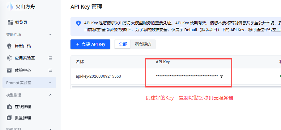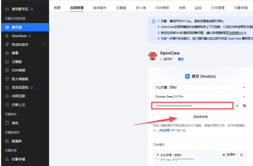 复制完成后返回控制台OpenClaw配置面板,将复制的API Key填入模型配置的卡片,然后单击添加并应用按钮