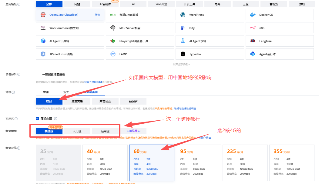 ②地域主要考虑后续需要调用国内模型还是海外模型,如调用国内模型一般推荐国内地域的服务器。