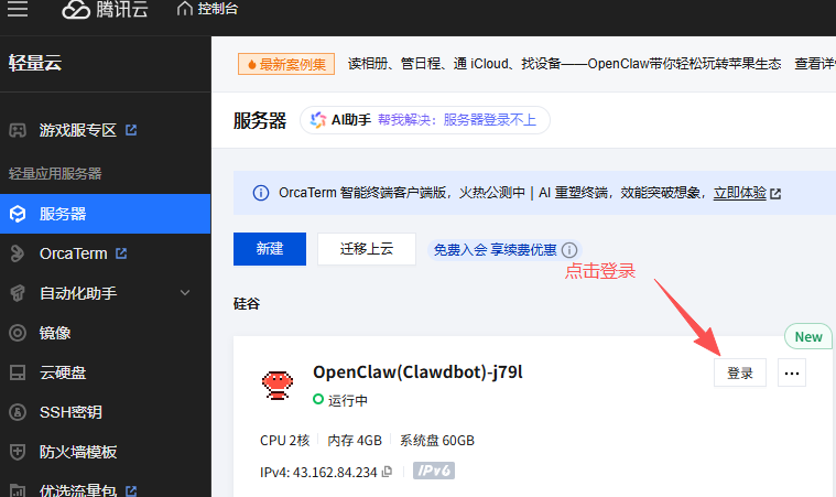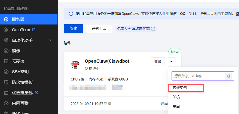 首先进入轻量云产品控制台,选中对应的已部署OpenClaw的轻量应用服务器,点击之后进入“管理实例”页面