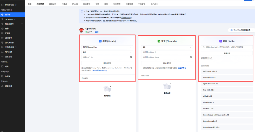 接下来即可在控制台界面上进行OpenClaw的模型(Models)配置、通道(Channels)配置(包括、企微、钉钉、飞书等)。