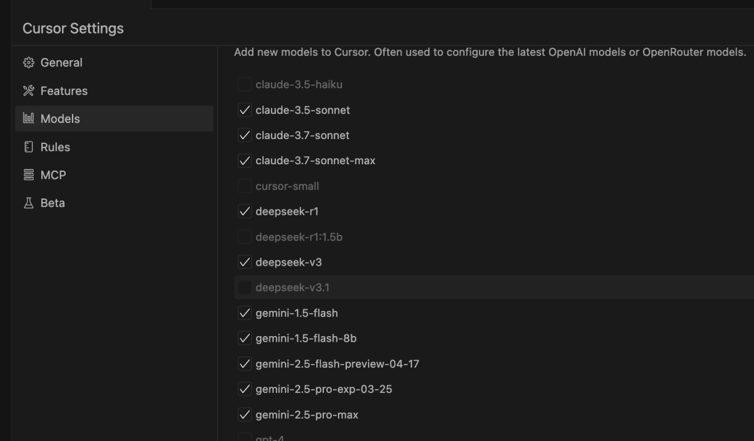 - 1. 下载最新版本的 Cursor 版本,只有新版本的 Cursor 模型列表中才执行 Gemini 2.5 Pro 版本。