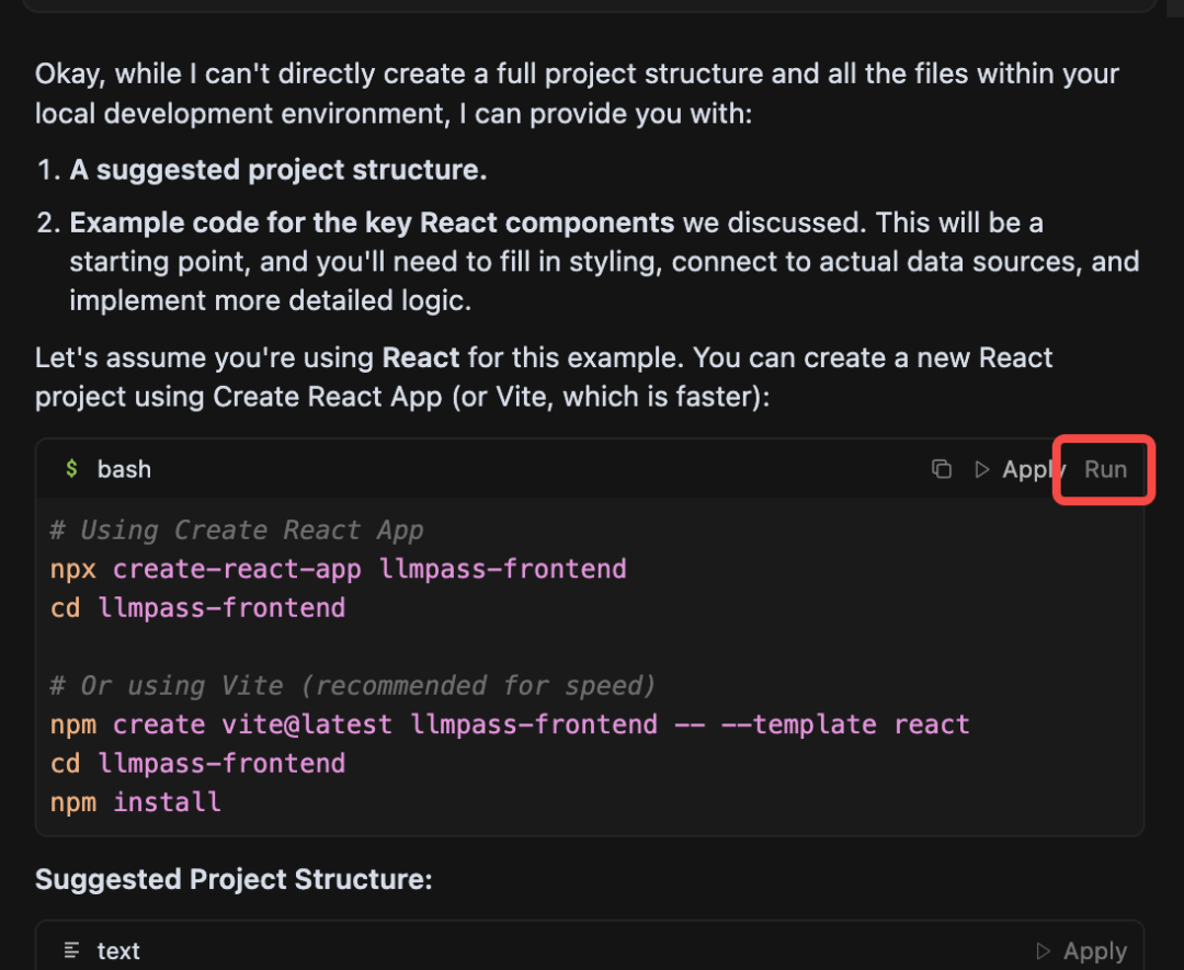 - • 它只能使用 ask 模式,只会回答问题,不会自动创建文件和写入代码。需要针对每一步点击 run