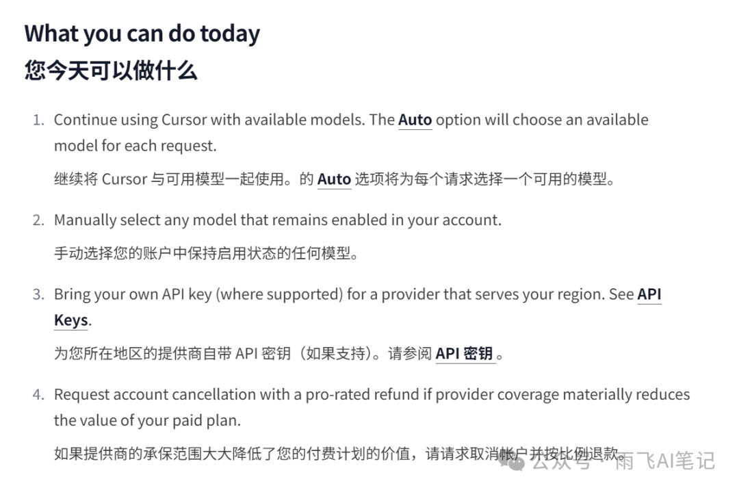 Cursor 官方给我们提供了几个方案,一个是继续使用 Auto 模式,可以自动选择可用的模型,另外则是使用自己的 API key,或者退款。很明显,我们使用 Cursor 还是要用它的 Claude 模型,为此雨飞给大家带来几个可用的方案。