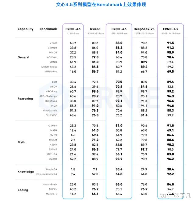 有Qwen3的珠玉在前,后来的开源模型难免要与之对比,文心团队毫不避讳的在报告中大量引用于Qwen3,Qwen2.5的对比数据,尽管这些数据显示文心4.5在各方面都占不到优势。但相比4.0时代连对比测试都不参加来说,敢于正视差距也是进步的开始。