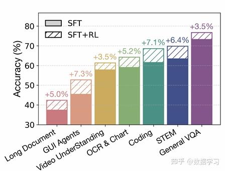 通过这种动态的“因材施教”,RLCS 显著提升了训练效率和模型的性能上限。技术报告中的数据显示,在引入RL后,模型在多个任务上的准确率获得了高达 +7.3% 的巨幅提升,直观地证明了该框架的有效性。